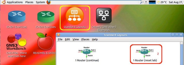 Let’s start in the GNS3 WorkBench environment by opening the Desktop shortcut Standard Layouts. From here, open the lab 1 Router (reset lab).