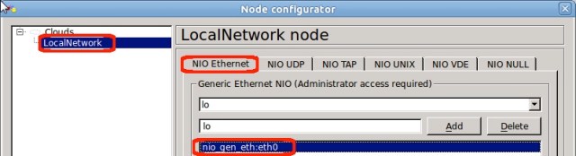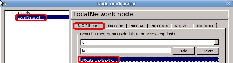 In the Node configurator dialogue that opens, select Local Network in the left-hand pane, and then select the NIO Ethernet tab. Notice that there is already a mapping for nio gen_eth:eth0 associated with this particular node – which by the way is a node of type Cloud in the GNS3 configuration, but has had an icon looking like a PC associated with it. The other PC icon vPCx and the SerialCloud are also cloud type nodes.