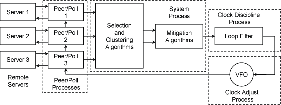 So I decided to find out a bit more about this poll timer and how it works. Firstly, it turns out that adding the extra NTP servers was a good idea. NTP doesn’t just take the first timestamp packet it sees to set the clock. Instead, it build a database of information built up from successive polls to multiple servers. I found this diagram that gives a nice picture: