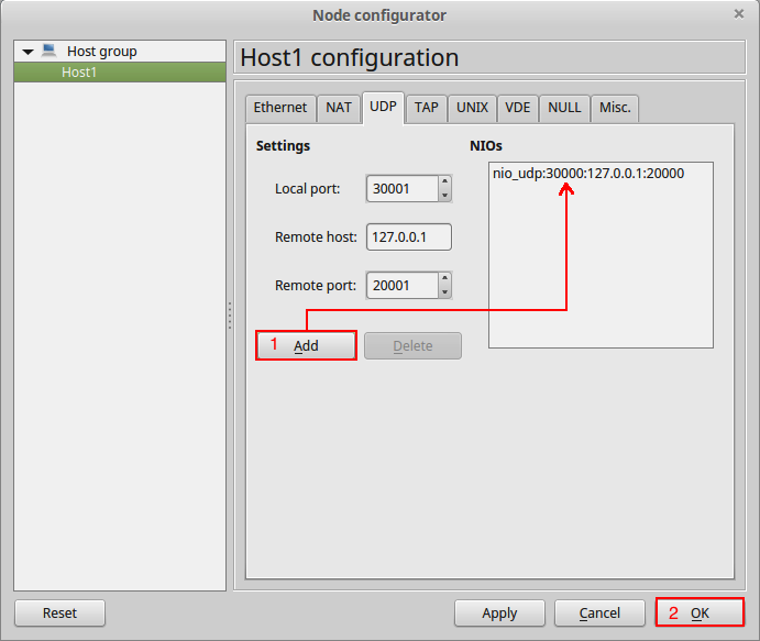 Initially, the settings should be just perfect for VPCS[1] – with the Local port setting at 30000, the Remote host set to 127.0.0.1, and the Remote port set to 20000, so click the Add button, then click OK.