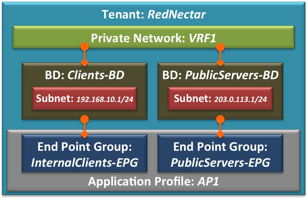 For our example, I will begin by creating one Application Profile (AP), and two End Point Groups (EPGs) within the AP. The following diagram shows the expanded model of the tenant RedNectar