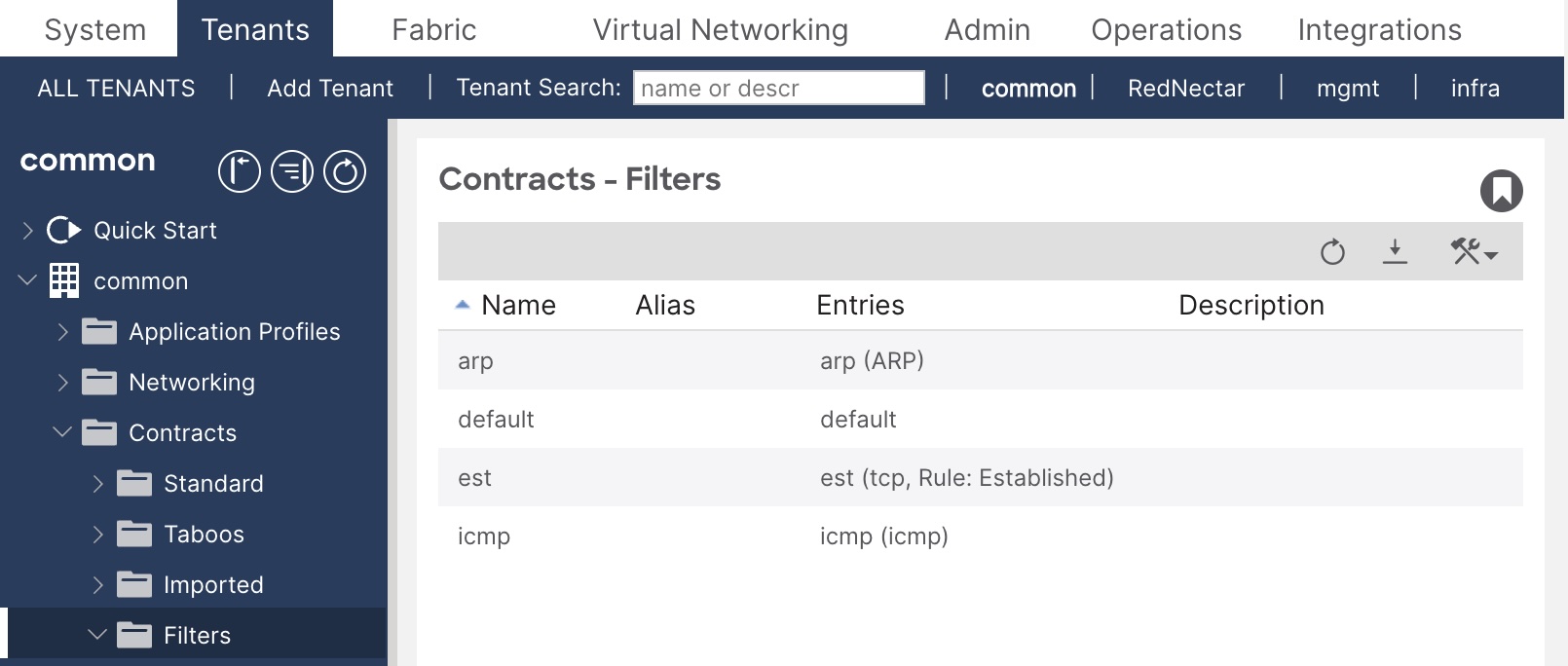 - Note that there are a set of pre-defined filters defined in the common Tenant. These filter can be linked to any Subject in any Contract in any other Tenant.