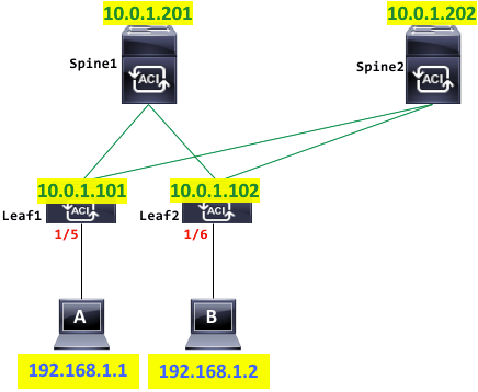 - HostB has a MAC address of B and an IP address of 192.168.1.2 and is attached to port 1/6 on Leaf2