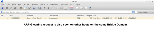 • ARP Gleaning requests are flooded throughout the Bridge Domain – this is demonstrated by looking at the packet capture of the VM on Leaf101 – it is on the same Bridge Domain but different EPG – yet it still saw the ARP Gleaning broadcast, as shown below: