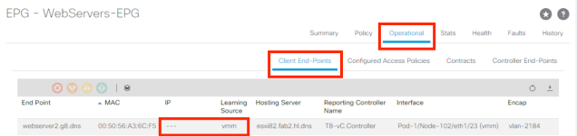 • Good point, but if you look closely at the screenshot (I know it is very small) you can see that the Learning Source shows vmm only, meaning that the APIC only knows about the VM because vCenter told it. In fact at this stage the VM was powered off.