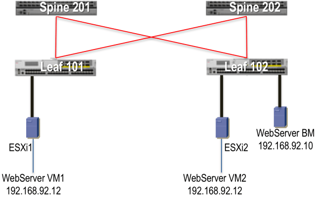 • WebServer VM2 and WebServer BM are on the same EPG, WebServer VM1 is on a different EPG.