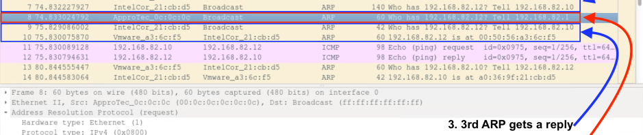 So as you can see in the capture above, it is not until the target has responded to the Gleaning ARP that it gets the ARP request from the source station.