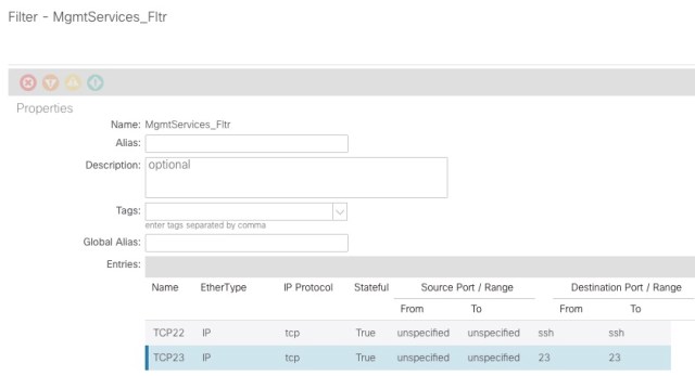 Let’s say you create a filter called MgmtServices_Fltr and add two entries. One for port 22 and one for port 23 (Destination ports of course)