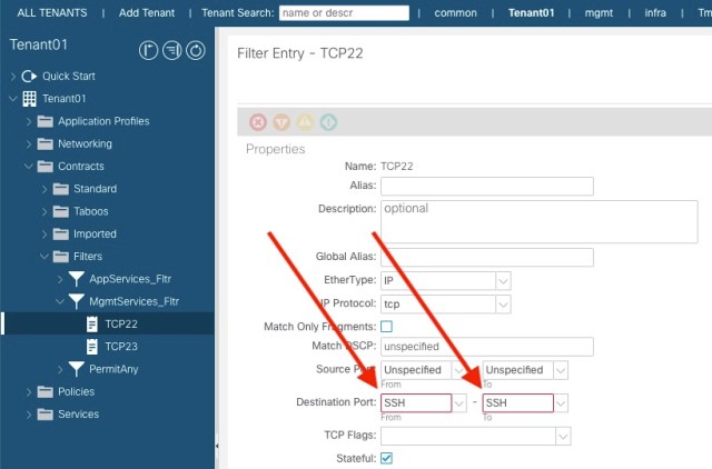 So, any contract that has a filter based on port 22, when pushed to the switches is transformed into a filter on unspecified. I.E. ALL TRAFFIC.