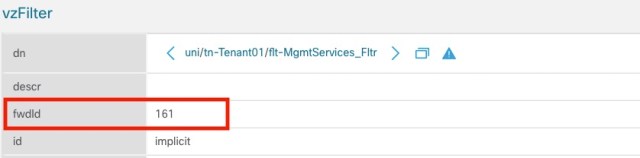 apic1# fabric 2201 show zoning-filter filter 161 ---------------------------------------------------------------- Node 2201 (Leaf2201) ---------------------------------------------------------------- +----------+-------+--------+-------------+------+-------------+----------+-------------+-------------+-------------+-------------+-------+-------------+-------------+----------+ | FilterId | Name | EtherT | ArpOpc | Prot | ApplyToFrag | Stateful | SFromPort | SToPort | DFromPort | DToPort | Prio | Icmpv4T | Icmpv6T | TcpRules | +----------+-------+--------+-------------+------+-------------+----------+-------------+-------------+-------------+-------------+-------+-------------+-------------+----------+ | 161 | 161_1 | ip | unspecified | tcp | no | yes | unspecified | unspecified | unspecified | unspecified | proto | unspecified | unspecified | | | 161 | 161_0 | ip | unspecified | tcp | no | yes | unspecified | unspecified | 23 | 23 | dport | unspecified | unspecified | | +----------+-------+--------+-------------+------+-------------+----------+-------------+-------------+-------------+-------------+-------+-------------+-------------+----------+