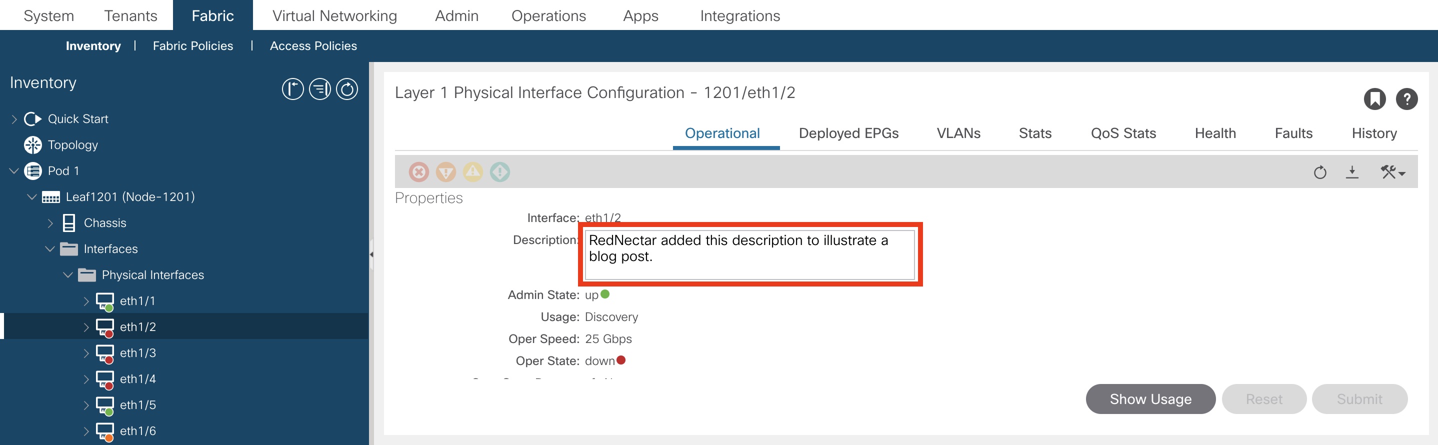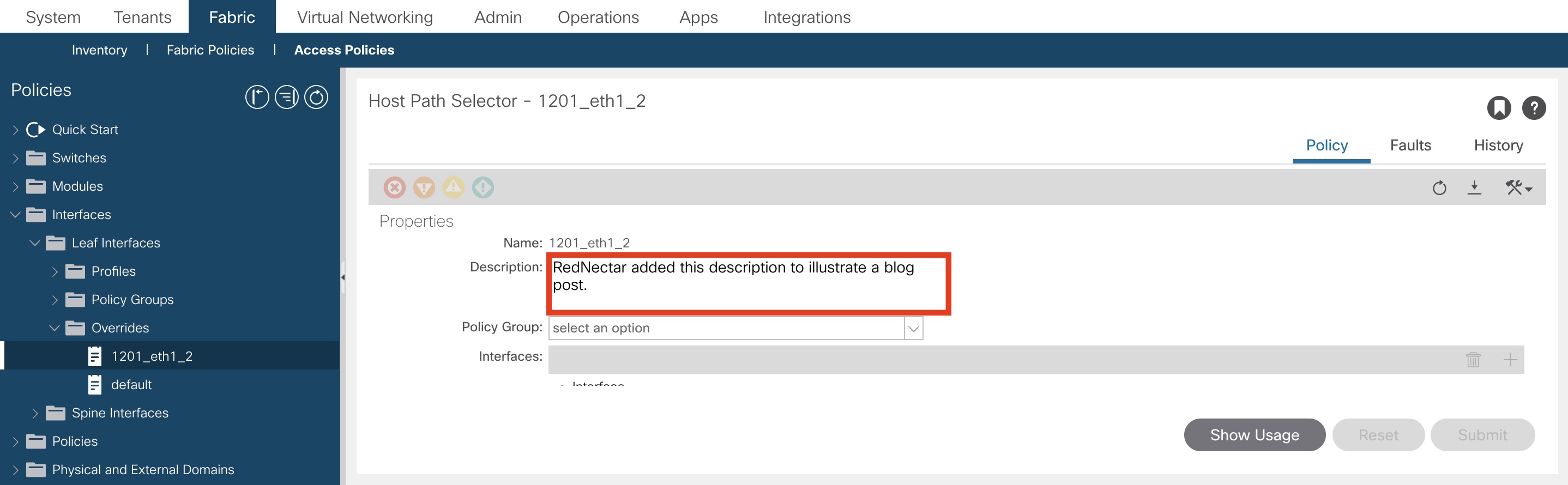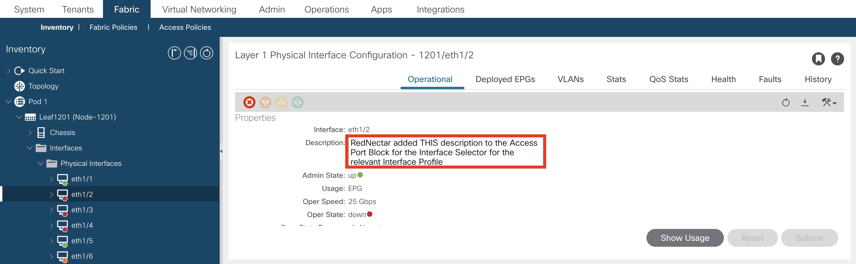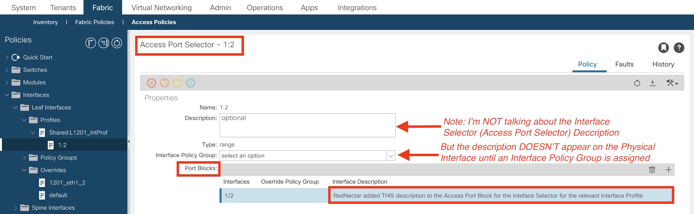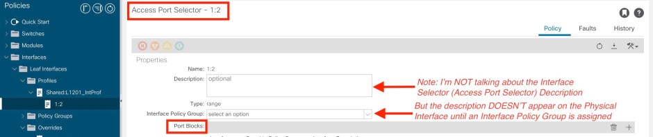 - You add a description to the Access Port Block for the Interface Selector for the relevant Interface Profile, where again it mysteriously appears in the Physical Interface description under the Fabric > Inventory path
