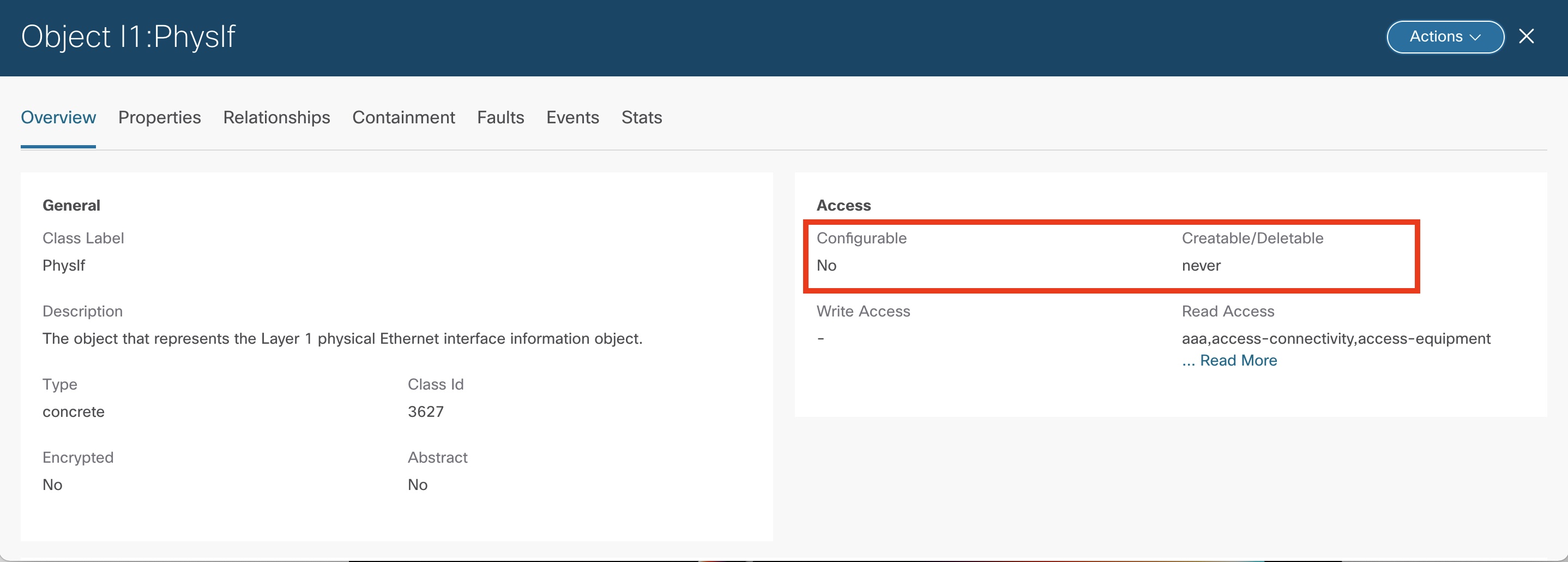 Right-clicking on the interface to view the interface in the object-store browser (visore) reveals that the object belongs to the l1PhyIf class…
