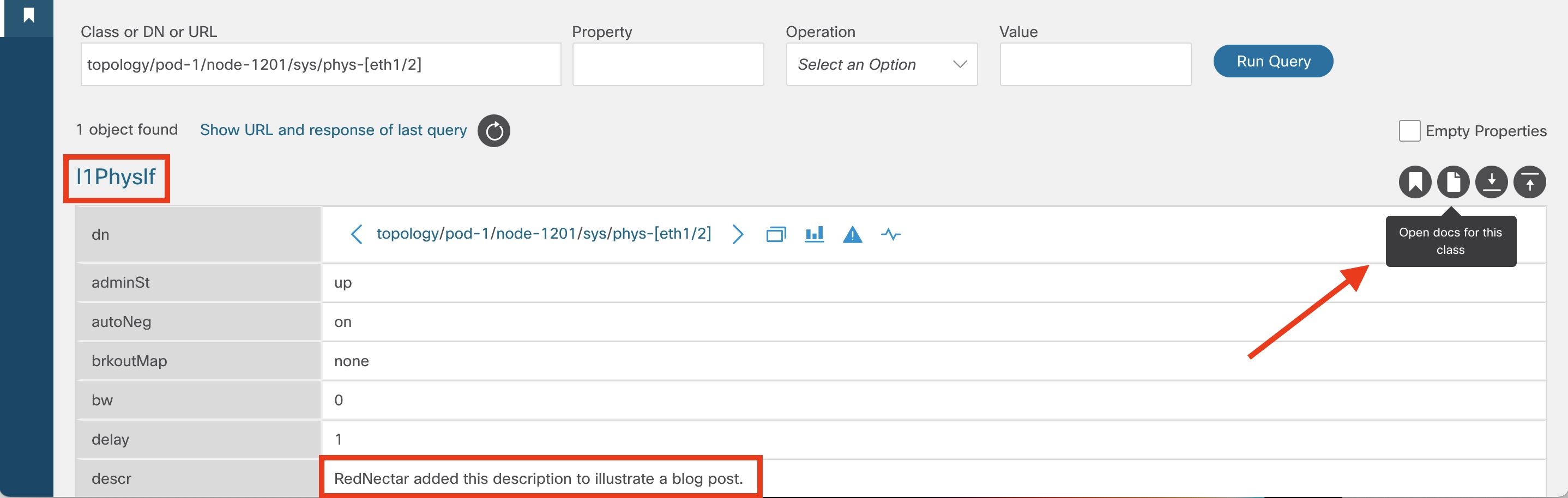 So what happens behind the scenes is that when you edit this non-configurable object, ACI hides it away in a place that is configurable – namely (in my example) uni/infra/hpaths-1201_eth1_2/rsHPathAtt-[topology/pod-1/paths-1201/pathep-[eth1/2]] which, as you can guess is the DN of the Override I illustrated earlier.