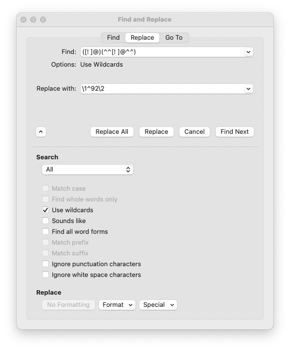 The next problem is the replacement part. For that I use the special MS Word tags \1 and \2 which correspond to the first and second search groups respectively. But that causes another problem – I actually want to USE a backslash character in my replacement string – and of course it too is a special character. So you’d think, using the logic that if ^^ finds a single ^, then ^\ (or even \) would do in the replacement section to insert a backslash.