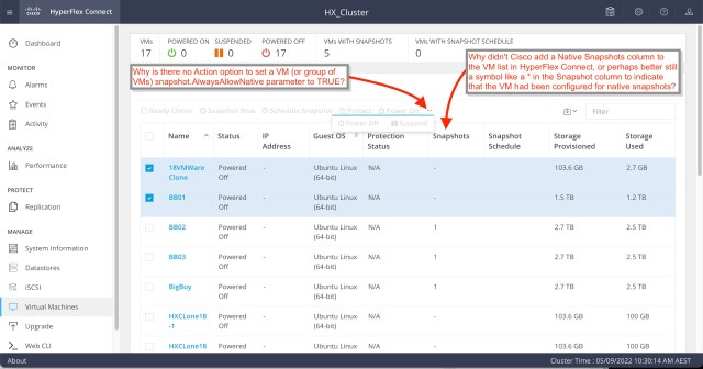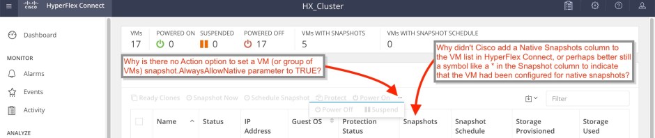 Why didn’t Cisco add a Native Snapshots column to the VM list in HyperFlex Connect, or perhaps better still a symbol like a * in the Snapshot column to indicate that the VM had been configured for native snapshots?