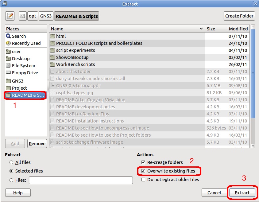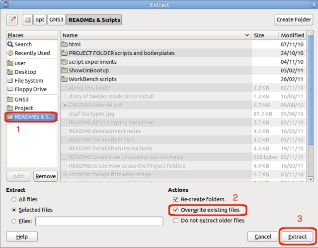 From the Archive Manage, click on the Extract Files icon, and navigate to the /opt/GNS3/READMEs & Scripts – there is a shortcut to this folder in the left hand pane: